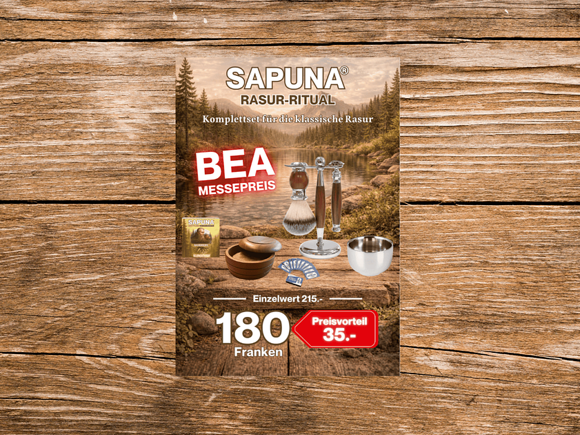 SAPUNA® Rasurritual Komplettset für die klassische Rasur. Enthalten sind das Rasierset SCHNEIDWERK, die Rasierseife KLINGENRUF, die Rasierseifenschale RITUALTROG, die Rasierschüssel SCHAUMSCHMIEDE sowie FlyDear Super Platinum Rasierklingen, 10 Stück.